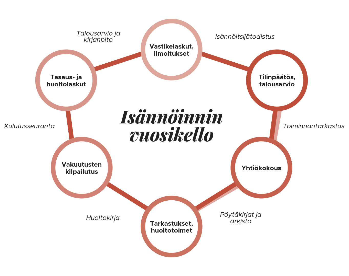 IsännöinninvuosikelloIsännöinnin vuosikello helpottaa taloyhtiön arkea ja muistuttaa vuosittaisista toistuvista asioista. Klikkaa kuva isommaksi.